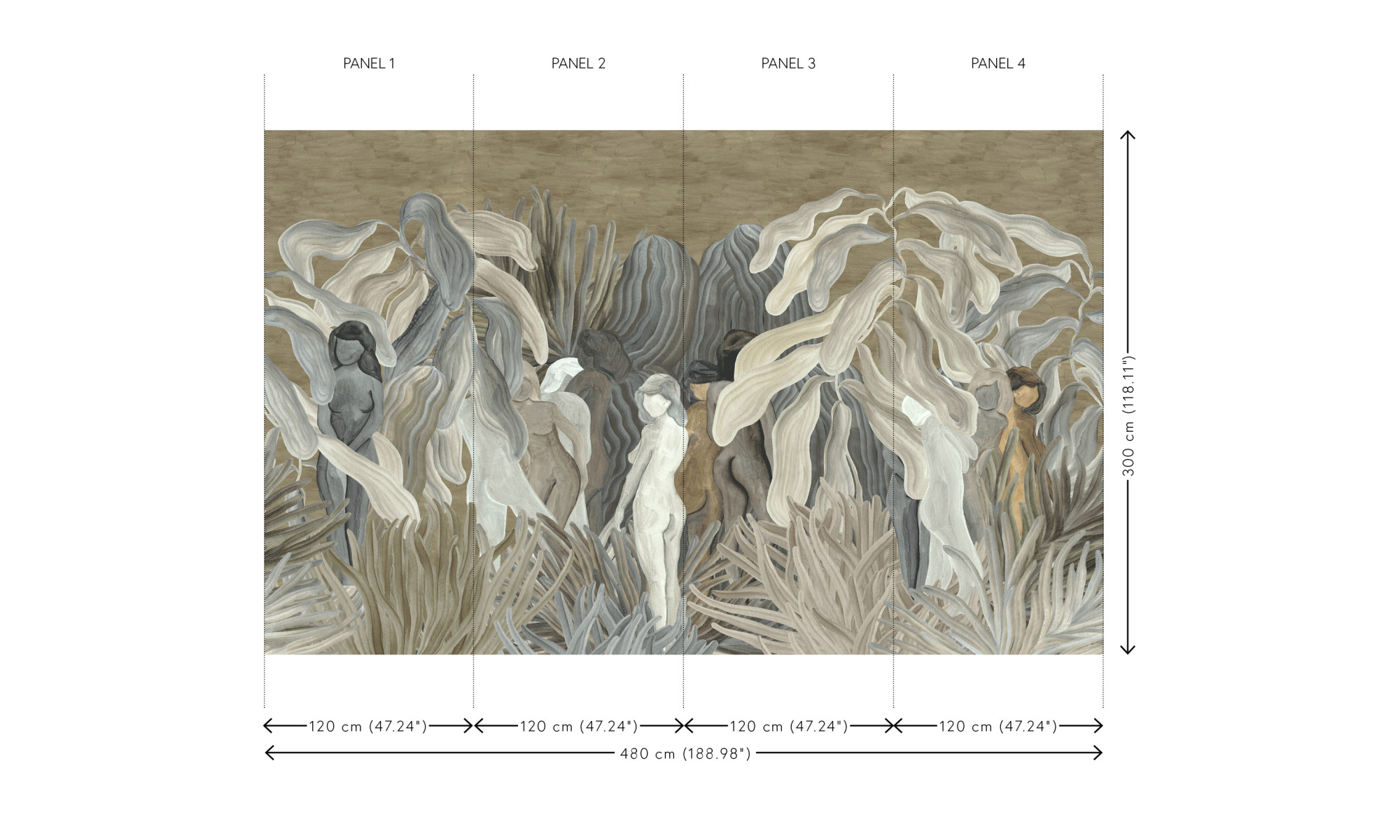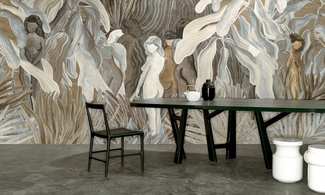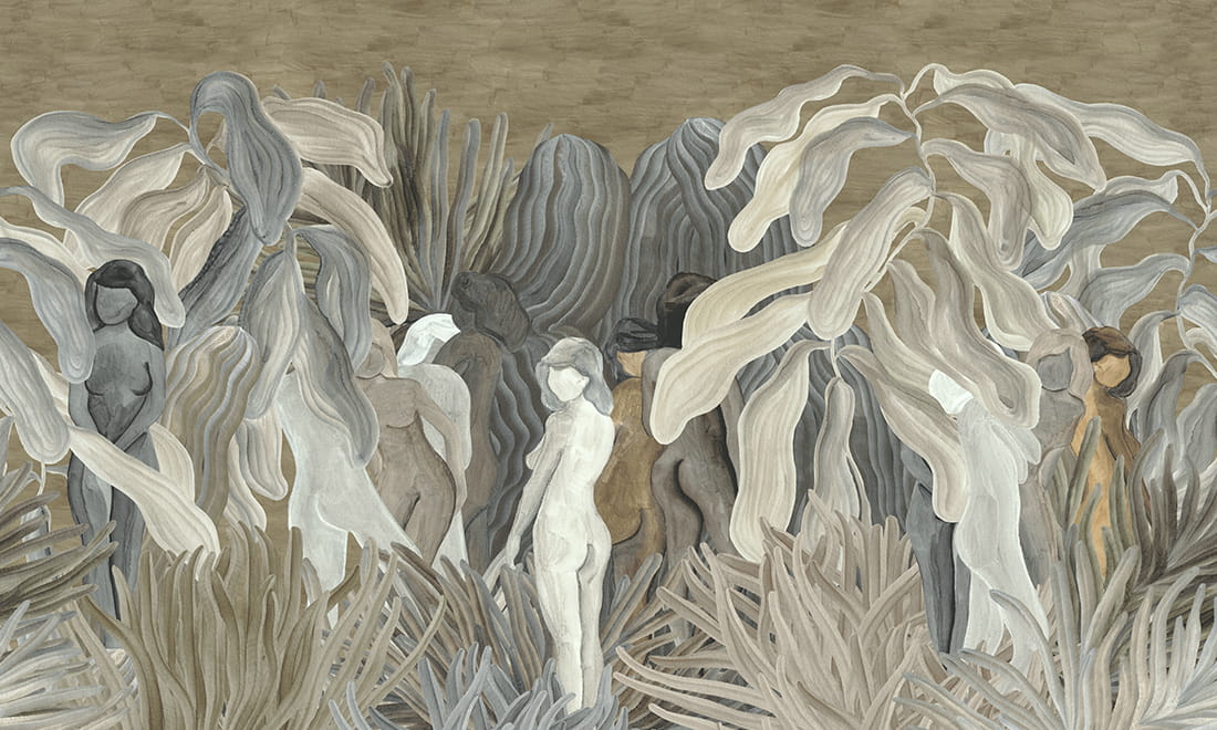 Tajemnicze, kobiece sylwetki patrzą na Ciebie i przenoszą w fantastyczną historię. Ta marzycielska scena o zaokrąglonych kształtach przemawia do wyobraźni niczym obraz. Zastosowany miękki materiał szenilowy idealnie pasuje do tej panoramy.