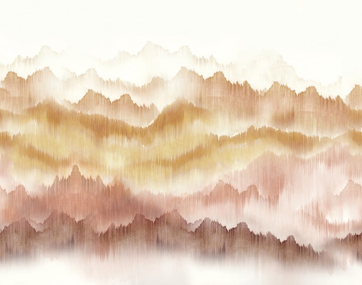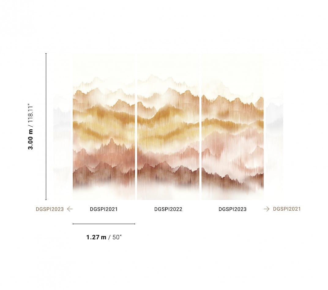 Mural Khroma Spirit of Nature DGSPI2022 Vista Sunset to wielkoformatowa dekoracja ścienna o wzorze panoramicznych gór, pierwotnie namalowanych na przędzy tekstylnej, co dało cudowny efekt akwareli. Co więcej nieregularne tło dodaje głębi i wyjątkowego efektu ręcznego rysunku. Cały mural Khroma Spirit of Nature Vista Sunset składa się z trzech oddzielnych paneli - DGSPI2021, DGSPI2022, DGSPI2023, które należy połączyć, aby uzyskać pożądany efekt.