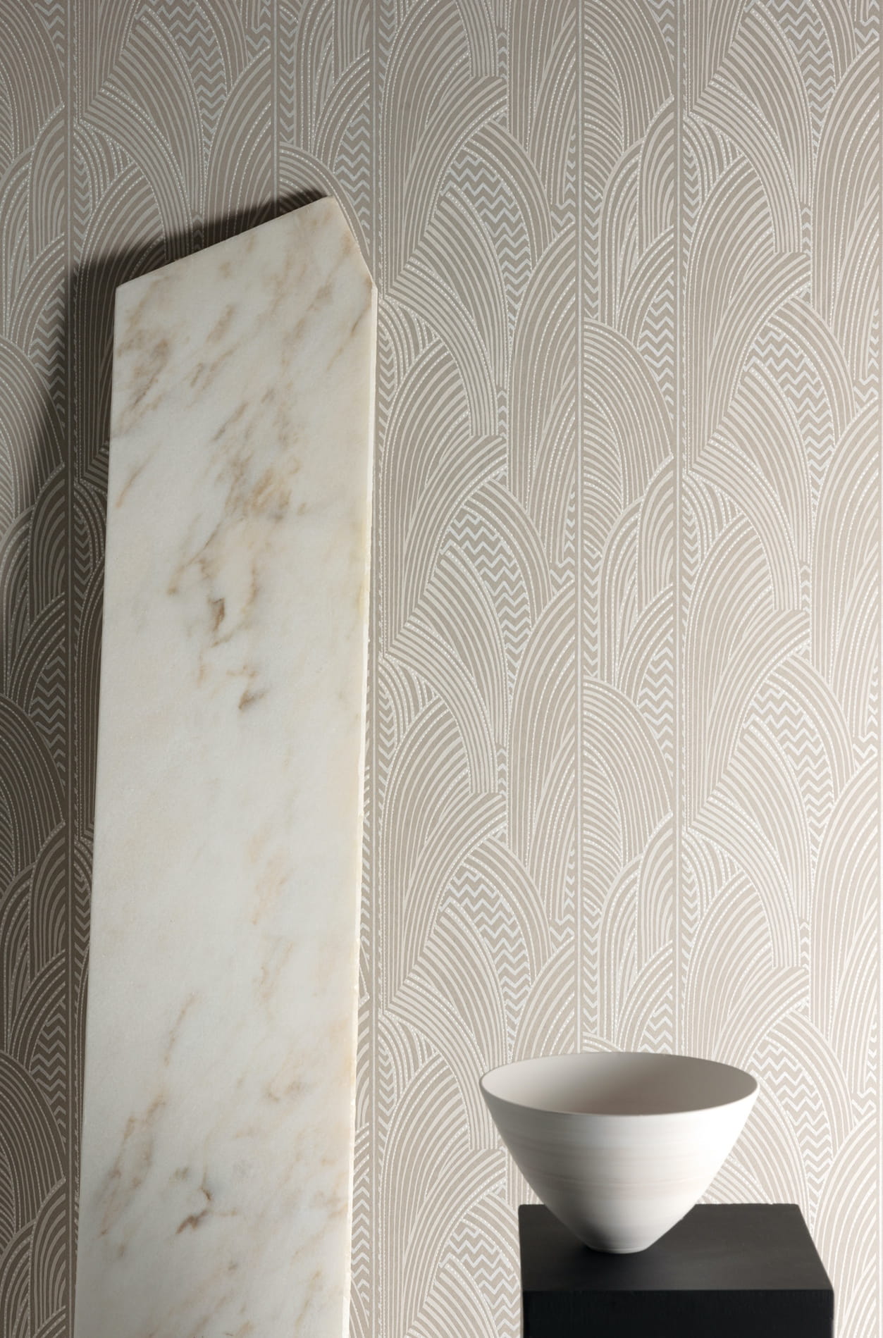 Elegancki wzór, na którym dużo się dzieje. Motyw łuków oraz zygzaków został przedzielony pionowymi liniami, które tworzą rożnej szerokości pasy. Dodatkowo na projekcie widoczne są wyczuwalne w dotyku, błyszczące kropeczki, nadające luksusowego charakteru tapecie. Projekt odnajdzie się w eleganckich wnętrzach utrzymanych w eklektycznym oraz artdecowskim stylu. Tapeta z łukami jest dostępna w trzech wariantach kolorystycznych, doskonale sprawdzi się na akcentowej ścianie w stylowej sypialni, jadalni oraz salonie. Wzór jest wykonany na flizelinowym podłożu, które jest bardziej odporne na uszkodzenia podczas montażu, charakteryzuje się zmywalnością oraz odpornością na działanie światła. Katalog Agathe to zbiór inspirowany szalonymi latami 20-tymi XX wieku. Katalog jest pozytywnym spojrzeniem w przyszłość, łączy w sobie rożne style oraz nurty artystyczne. Eklektyczne wzory tapet i murali zaskakują mnogością kolorów oraz metalicznymi elementami. Można tu spotkać geometryczne kształty, abstrakcyjne motywy, nowoczesne wzory oraz kolorystycznie dopasowane tła, które sprawią, że aranżacje nabiorą głębi i charakteru.