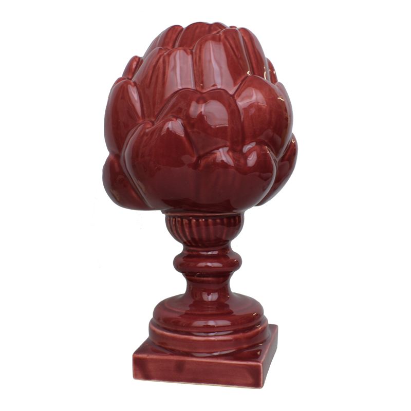 Dekoracyjny karczoch o wysokości 25 cm, wykonany z masy fajansowej, szkliwiony na głęboki wiśniowy kolor. Elegancka, błyszcząca forma na stabilnej podstawie, idealna jako stylowy akcent we wnętrzu.