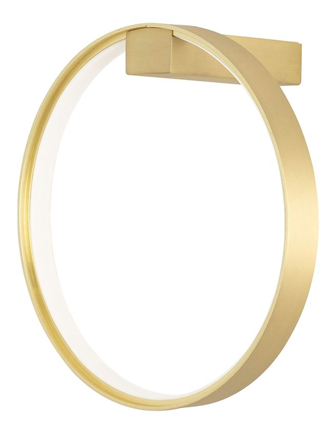 Kinkiet w kształcie okręgu wykonany w całości z aluminium w kolorze złotym. Klosz pod akrylową osłoną skrywa ledowe źródło światła.