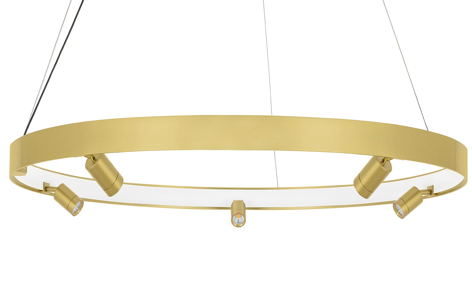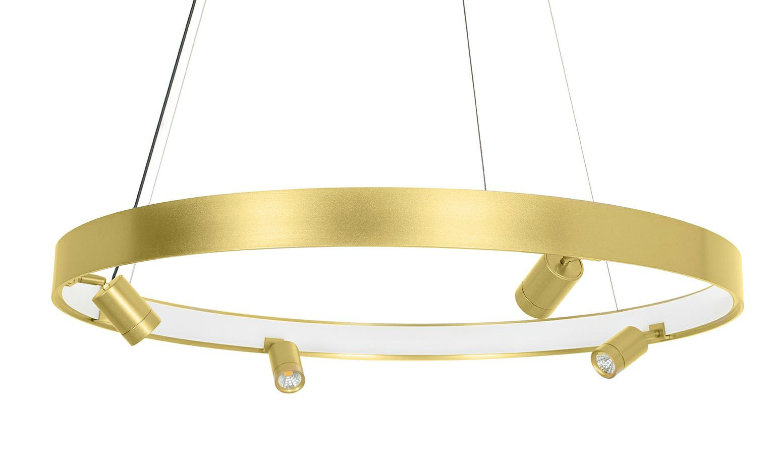 Lampa wisząca została wykonana ze stali nierdzewnej w kolorze złotym. Okrągły klosz pod akrylową osłoną skrywa ledowe źródło światła. Oprawa jest wzbogacona czterema dodatkowymi punktami świetlnymi. Całość zawieszona na podsufitce w kolorze złotym, przewodzie i stalowych linkach.