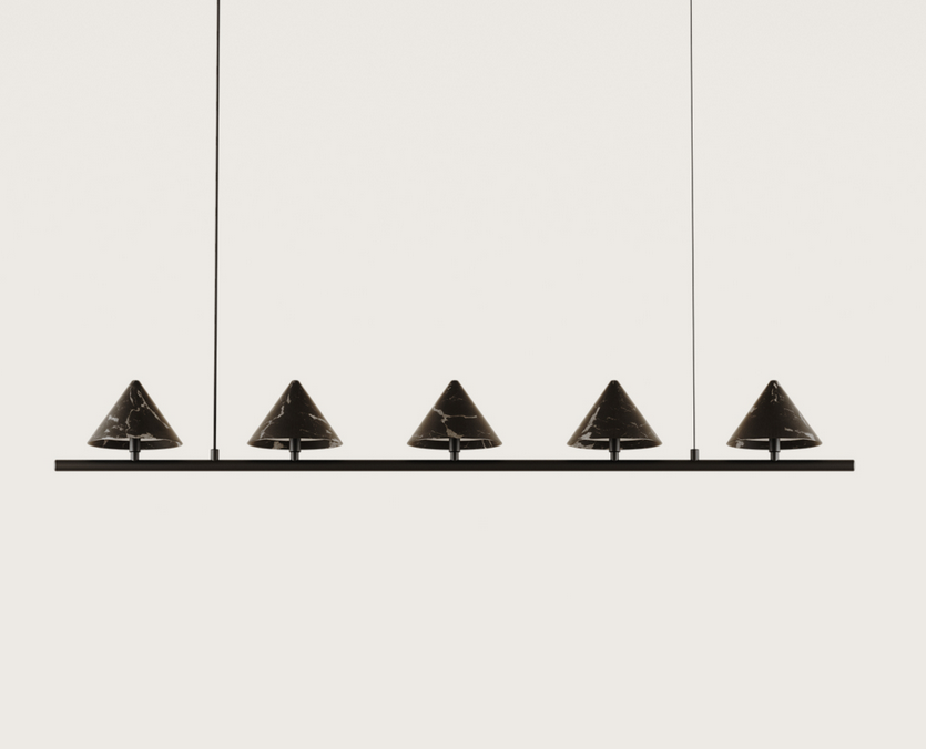 Ta stylowa wisząca lampa przyciąga uwagę minimalistyczną formą oraz precyzyjnym wykonaniem z wysokiej jakości materiałów. Połączenie naturalnego marmuru z metalowymi elementami nadaje jej nowoczesny, a jednocześnie ponadczasowy charakter. Lampa została wyposażona w pięć stożkowych kloszy o średnicy 140 mm, osadzonych na smukłej, stalowej belce. Jej maksymalna wysokość wynosi 3000 mm, co pozwala na dopasowanie do różnych wysokości pomieszczeń – od jadalni, przez kuchnię z wyspą, aż po przestrzenie komercyjne. Istnieje również możliwość wykończenia metalowych elementów lampy- złoty metal w połączeniu z białymi, marmurowymi kloszami, dostępnego za dodatkową opłatą.