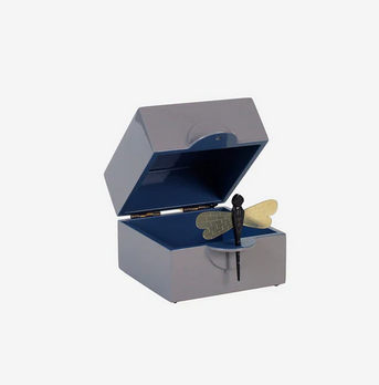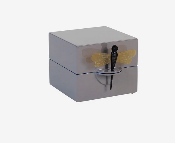 Eleganckie pudełko wykonane z wysokiej jakości MDF, pokryte 13–15 warstwami ręcznie nakładanej lakierowanej powłoki.Zdobione motywem ważki z rogu bawołu. Zewnętrzna strona w eleganckim odcieniu slate, wnętrze-denim. Wymiary: 12 × 12 × 10 cm. Czyścić miękką, lekko wilgotną ściereczką.